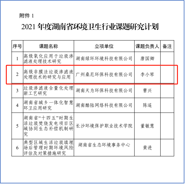 2021年2月4日,我司“高級非膜法垃圾滲濾液處理技術的研究與應用”課題列入 2021 年度湖南省環(huán)境衛(wèi)生行業(yè)課題研究計劃。